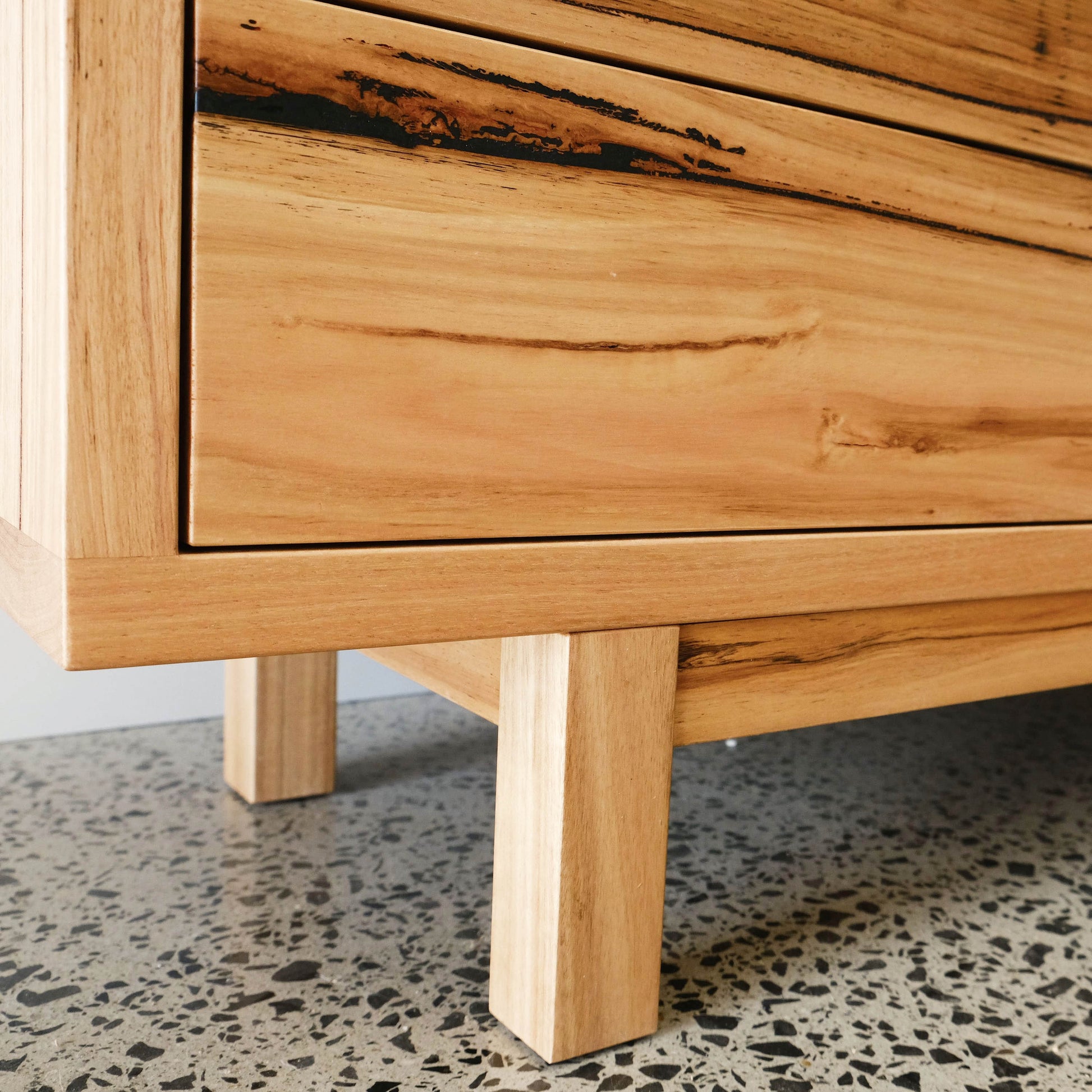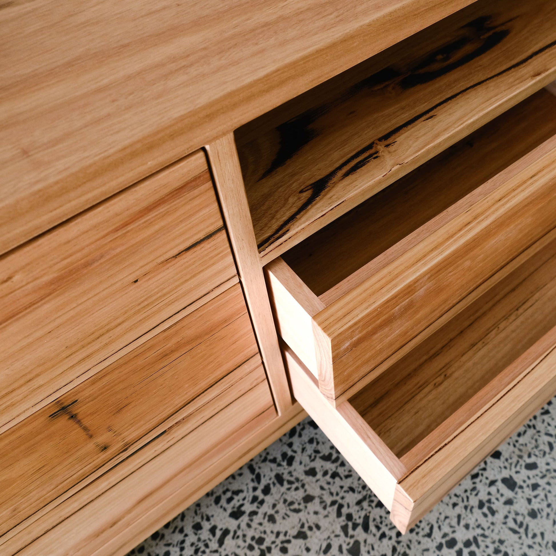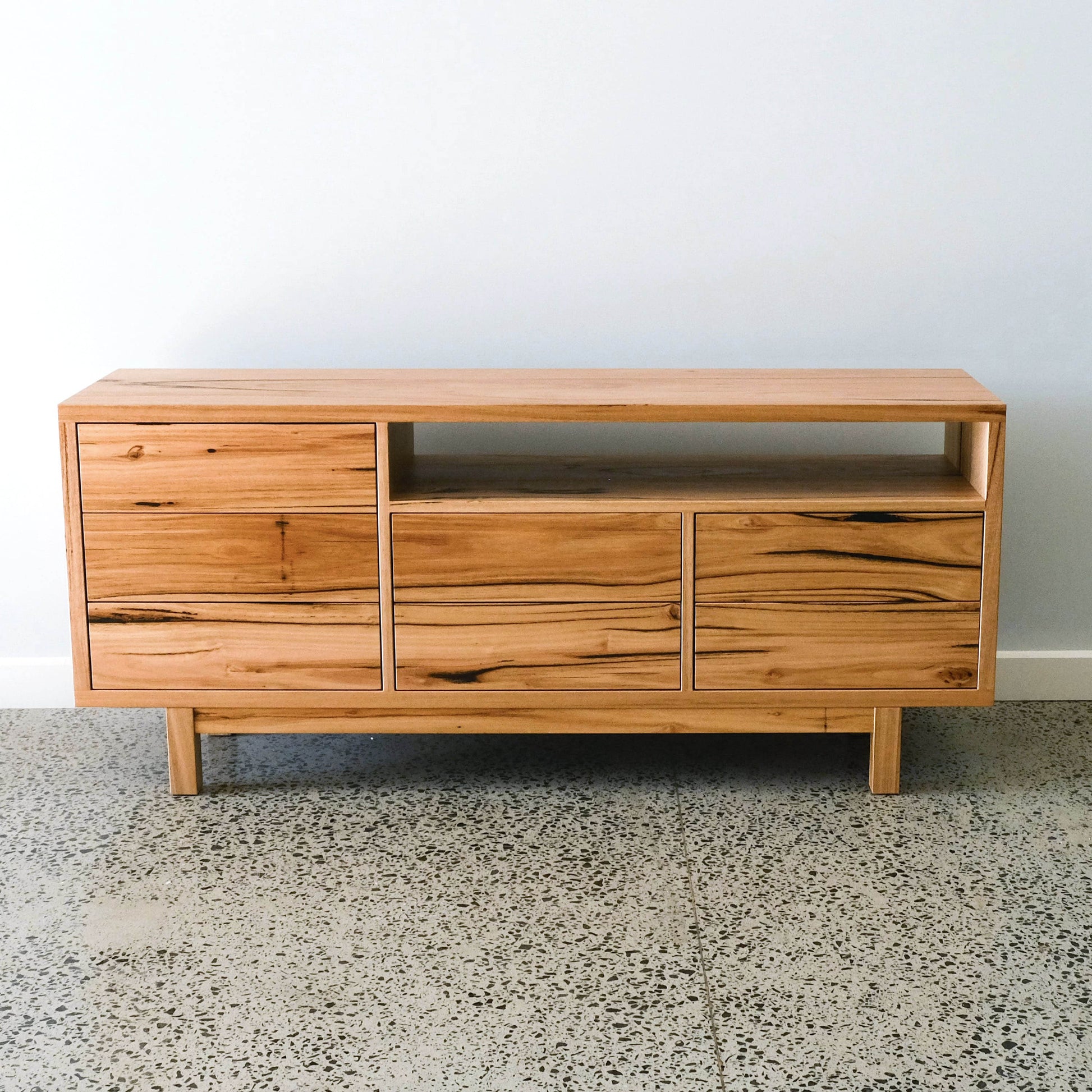 The Heathcote entertainment unit brings clean, straight-lined simplicity to your living room with practical storage that lets the natural beauty of timber take centre stage. This solid timber entertainment unit features an open shelf for media equipment plus heaps of push-to-open drawers that maintain the unit's uncluttered aesthetic. Handcrafted from Wormy Chestnut, the piece showcases distinctive dark grain lines and natural character markings unique to this Australian eucalyptus timber.